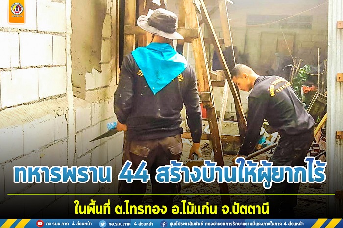เมื่อวันที่ 13 ธันวาคม 2565 หน่วยเฉพาะกิจกรมทหารพรานที่ 44 จัดกำลังพลของหน่วย ร่วมกับประชาชนในพื้นที่ ดำเนินการก่อสร้างบ้านพักอาศัยเลขที่ 149/1 หมู่ที่ 1 บ้านโคกนิบง ตำบลไทรทอง อำเภอไม้แก่น จังหวัดปัตตานี เพื่อช่วยเหลือและบรรเทาความเดือดร้อนให้กับ นางสาวไอณี มะหะมะ ซึ่งเป็นผู้ที่มีฐานะยากไร้ในพื้นที่ และได้รับการคัดเลือกในด้านการพัฒนาคุณภาพชีวิต ภายใต้โครงการ “บ้านปันสุข” โดย หน่วยเฉพาะกิจปัตตานี ร่วมกับ หน่วยเฉพาะกิจกรมทหารพรานที่ 44 สร้างที่พักอาศัยให้ครอบครัวผู้ยากไร้มีคุณภาพชีวิตที่ดีขึ้น รวมทั้งเป็นการบรรเทาความเดือดร้อนให้กับพี่น้องประชาชนอันเนื่องจากสถานการณ์ในยุคปัจจุบัน
