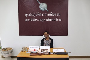 เจ้าหน้าที่เดินทางไปถึงพบบ้านพักหลังดังกล่าวอยู่ภายในสวนผลไม้บนเนินเขาทางเข้าน้ำตกน้ำตกเฉลิมพระเกียรติ ร.9 บ้านวังใหม่ พบนายศิริวุธ วงศ์สวัสดิ์ อายุ 35 ปี รับเป็นเจ้าของบ้าน เจ้าหน้าที่จึงขอทำการตรวจค้น พบยาบ้า จำนวน 21 เม็ด อุปกรณ์การเสพยา ถุงพลาสติกใสไว้สำหรับแบ่งใส่ยา จำนวน 13 ถุง อาวุธปืนลูกซองสั้นไทยประดิษฐ์ 1 กระบอก กระสุนปืนลูกซองขนาดเบอร์ 12 จำนวน 1 นัด ปืนอัดลม 1 กระบอก