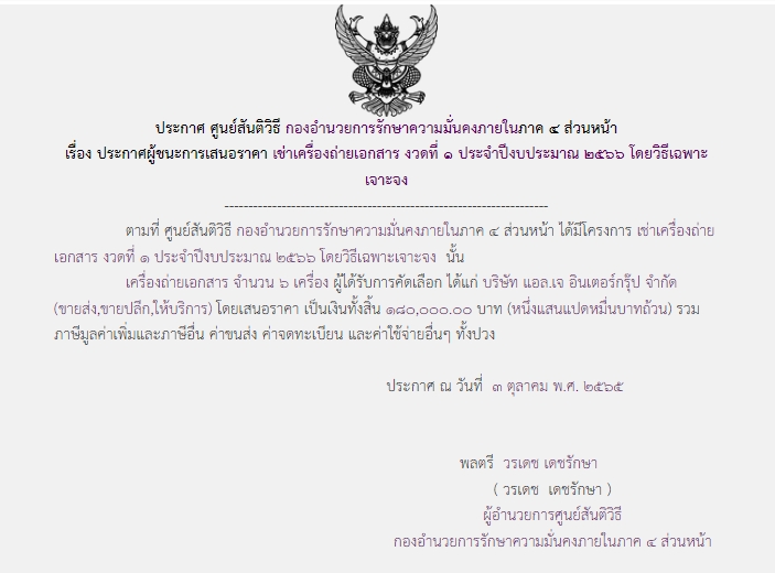 ประกาศผู้ชนะการเสนอราคา เช่าเครื่องถ่ายเอกสาร งวดที่ ๑ ประจำปีงบประมาณ ๒๕๖๖ โดยวิธีเฉพาะเจาะจง