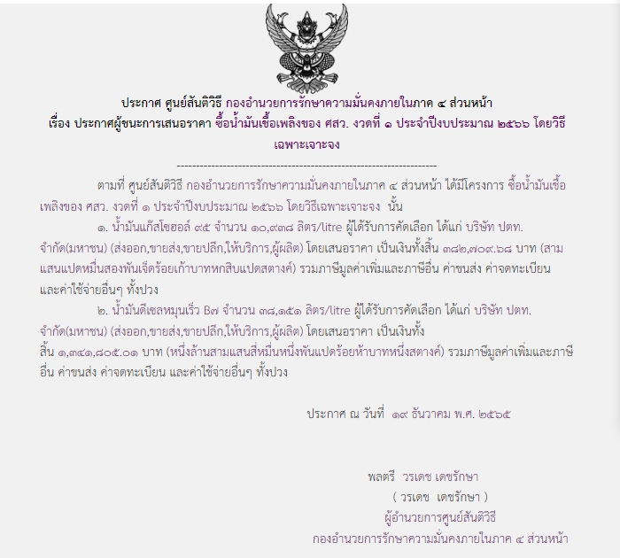 จัดซื้อ จัดจ้างประกาศผู้ชนะการเสนอราคา ประกาศผู้ชนะการเสนอราคา ซื้อน้ำมันเชื้อเพลิงของ ศสว. งวดที่ ๑ ประจำปีงบประมาณ ๒๕๖๖ โดยวิธีเฉพาะเจาะจง December 21, 2022 380 Share Facebook Twitter Google+ Telegram LINE