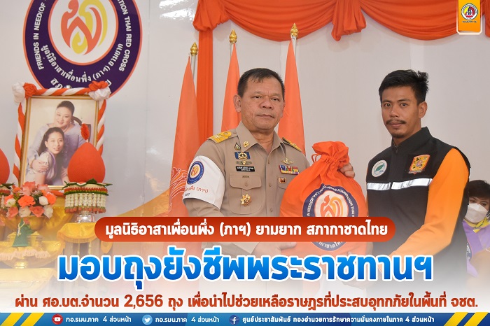 ทั้งนี้ด้วยสถานการณ์อุทกภัยที่เกิดขึ้นในพื้นที่จังหวัดชายแดนภาคใต้ตั้งแต่ วันที่ 17 ธันวาคม 2565 ที่ผ่านมา ทำให้ราษฎรในพื้นที่ได้รับความเสียหายทั้งชีวิตและทรัพย์สิน ตลอดจนมีพืชผลทางการเกษตรและสิ่งสาธารณประโยชน์ได้รับความเสียหายเป็นจำนวนมาก ศอ.บต.จึงได้ขอความอนุเคราะห์ถุงยังชีพพระราชทาน เพื่อช่วยเหลือผู้ประสบอุทกภัยในพื้นที่ไปยังมูลนิธิอาสาเพื่อนพึ่ง (ภาฯ) ยามยาก สภากาชาดไทยผ่าน ศอ.บต. จัดส่งถุงยังชีพพระราชทาน จำนวน 2,656 ถุง เพื่อนำแจกจ่ายพระภิกษุสงฆ์ จำนวน 156 ถุง และราษฎร จำนวน 2,500 ถุง โดยส่งต่อผ่านกลุ่มเครือข่ายภัยพิบัติชุมชน เพื่อนพึ่ง (ภาฯ) ชายแดนใต้ เครือข่ายอาสาสมัครป้องกันภัยฝ่ายพลเรือน และผู้แทนจังหวัดยะลา ปัตตานี และนราธิวาส เพื่อนำแจกจ่ายให้แก่ราษฎรที่ประสบภัยในพื้นที่ต่อไป