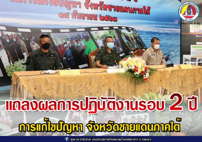 พลโท พรศักดิ์ พูลสวัสดิ์ แม่ทัพภาคที่ 4 /ผู้อำนวยการรักษาความมั่นคงภายในภาค 4 กล่าวว่า ตลอดระยะเวลา 2 ปีที่ผ่านมา ตั้งแต่รับหน้าที่แม่ทัพภาคที่ 4 ได้เน้นแก้ปัญหาหลักๆใน 2 เรื่อง คือ ปัญหายาเสพติดและการควบคุมพื้นที่ โดยเฉพาะการแก้ไขปัญหายาเสพติด ปีที่ผ่านมาสามารถจับกุมผู้ต้องหาคดียาเสพติดได้กว่า 3 หมื่นคน ยึดของกลางยาบ้า ยาไอซ์ ได้จำนวนมากนับพันกิโล สิ่งเหล่านี้เป็นเครื่องยืนยันได้ว่าการแก้ไขปัญหายาเสพติดสามารถดำเนินการได้ครบทุกรูปแบบ หลังจากได้มีการสอบถามผ่านสภาสันติสุขตำบลซึ่งเป็นตัวแทนของประชาชนในพื้นที่กว่า 2 ล้านคน ประชาชนต่างมีความพึงพอใจในการแก้ไขปัญหายาเสพติด ส่วนการแก้ปัญหาเรื่องความมั่นคงจะเห็นได้จากสถิติการก่อเหตุรุนแรงคดีความมั่นคงในพื้นที่ในช่วงปีที่ผ่านมาลดลงอย่างมากถึงร้อยละ 60 ประชาชนมีความสุข สามารถประกอบอาชีพดำเนินชีวิตได้อย่างปกติ เกิดความมั่นใจ และให้ความร่วมมือกับเจ้าหน้าที่รัฐด้วยดี เป็นแสงสว่างที่ปลายอุโมงค์ที่ทำให้เราได้เห็นว่าสถานการณ์ในพื้นที่เป็นไปในทิศทางที่ดี ต้องขอบคุณพี่น้องประชาชนที่ให้ความร่วมมือในทุกๆ เรื่อง ทั้งการช่วยแจ้งเบาะแสผู้ก่อเหตุรุนแรง การร่วมกันพัฒนาพื้นที่ ทั้งนี้การทำงานตลอด 2 ปี กอ.รมน.ภาค 4 ส่วนหน้า ได้ปรับแผน เน้นทำงานเชิงรุก โดยเฉพาะการตั้งชุดปฏิบัติการจรยุทธ์ เพื่อเข้าไปดูแลพี่น้องประชาชนในชุมชนและหมู่บ้าน ในลักษณะร่วมทุกข์ร่วมสุขกับชาวบ้าน ทำให้จำกัดเสรีการเคลื่อนไหวของผู้ก่อเหตุรุนแรงได้ผลเป็นอย่างดี นอกจากการควบคุมพื้นที่ให้ปลอดภัยแล้ว ในห้วงปีที่ผ่านมา เรายังต้องเผชิญกับวิกฤติ การแพร่ระบาดของโรคโควิด – 19 โดยเฉพาะพื้นที่ชายแดนที่ติดต่อกับประเทศเพื่อนบ้านทั้งมาเลเซียและพม่าซึ่งมีการระบาดของโรครุนแรง แต่ด้วยความร่วมมือ ช่วยกันทำงานของทุกภาคส่วน ตลอดจนพี่น้องประชาชนในพื้นที่ โดยมีหลักสำคัญว่า ต้องไม่มีผู้ที่มีเชื้อหลุดลอดเข้ามาตามแนวชายแดนโดยไม่ผ่านกระบวนการคัดกรองของสาธารณสุขโดยเด็ดขาด ทำให้เราสามารถสกัดกั้น ป้องกันตามแนวชายแดนได้เห็นผลอย่างมีประสิทธิภาพ จากความร่วมมือของหน่วยงานที่เกี่ยวข้องในการดูแลพื้นที่จังหวัดชายแดนภาคใต้ ซึ่งครอบคลุมในทุกมิติ ทั้งมิติของความมั่นคง เศรษฐกิจ และสังคม ส่งผลให้สถานการณ์ความไม่สงบในพื้นที่จังหวัดชายแดนภาคใต้มีแนวโน้มที่ดีขึ้น รวมถึงด้านเศรษฐกิจที่ได้รับการพัฒนาอย่างต่อเนื่อง พร้อมยกระดับ 3 เหลี่ยมเศรษฐกิจ มั่นคง มั่งคั่ง และยั่งยืน ที่เอื้อต่