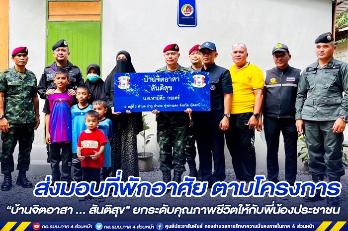 เมื่อวันที่ 22 ธันวาคม 2565 เวลา 10.30 น. ที่ บ้านเลขที่ 12 หมู่ที่ 2 ตำบลปากู อำเภอทุ่งยางแดง จังหวัดปัตตานี พันเอก อนุสรณ์ ประสพศรี รองผู้บังคับหน่วยเฉพาะกิจสันติสุข เป็นประธานในพิธีมอบที่พักอาศัย ภายใต้โครงการ “บ้านจิตอาสา … สันติสุข” โดยหน่วยเฉพาะกิจสันติสุขให้กับ นางสาวหามีด๊ะ กอเดร์ และครอบครัว เพื่อยกระดับคุณภาพชีวิตให้กับพี่น้องประชาชนผู้ยากไร้ โดยมี พันโท อินทัช รอดทอง รองผู้บังคับหน่วยเฉพาะกิจกรมทหารพรานที่ 44 พร้อมด้วยกำลังพล, ส่วนราชการที่เกี่ยวข้อง และผู้นำในพื้นที่ ร่วมในพิธีมอบบ้านดังกล่าว