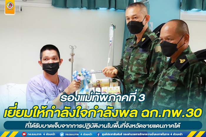 วันที่ 23 ธันวาคม 2565 เวลา 09.50 น. ที่ ตึกพิเศษชั้น 10 โรงพยาบาลศูนย์ยะลา อำเภอเมือง จังหวัดยะลา พลตรี กิตติพงศ์ ชื่นใจชน รองแม่ทัพภาคที่ 3 / รองผู้บัญชาการศูนย์ปฏิบัติการกองทัพภาคที่ 3 และคณะ ลงพื้นที่เยี่ยมให้กำลังใจ พร้อมมอบกระเช้าเยี่ยมให้กับกำลังพลของหน่วยเฉพาะกิจกรมทหารพรานที่ 30 ประกอบด้วย อาสาสมัครทหารพราน กรวิชญ์ ฝีปากเพราะ, อาสาสมัครทหารพราน พร้อมรบ ใฝ่ฝากจรรยา, อาสาสมัครทหารพราน นิพนธ์ เภรีประยูรพร ที่ได้รับบาดเจ็บจากเหตุคนร้ายลอบขว้างระเบิดชนิดไปป์บอมม์ ใส่ฐานปฏิบัติการกองร้อย 3009 และในเวลาใกล้เคียงกันคนร้ายได้ใช้อาวุธปืน เอ็ม .79 ยิงเข้าใส่ฐานปฏิบัติการชุดคุ้มครองตำบล (ชคต.) จำนวน 2 ลูก ซึ่งทั้งสองเหตุการณ์มีเจ้าหน้าที่ทหารพรานได้รับบาดเจ็บในการปฏิบัติหน้าที่ จำนวน 4 คน ล่าสุดอาการปลอดภัยดีแล้ว โดยมี พลตรี สัจนาท ถปะติวงศ์ หัวหน้าสำนักงาน ผู้อำนวยการรักษาความมั่นคงภายในภาค 4, พันเอก จิรศักดิ์ คงทน รองผู้บังคับหน่วยเฉพาะกิจยะลา, หน่วยเฉพาะกิจกรมทหารพรานที่ 33 ให้การต้อนรับ