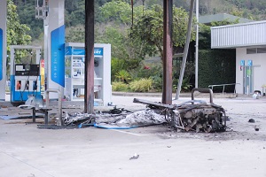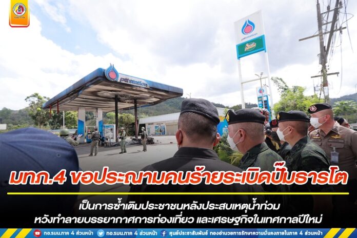 เมื่อคืนวันที่ 24 ธ.ค.65 เวลา 23.50 น. ได้รับแจ้งจากเจ้าหน้าที่วิทยุ สภ.ธารโต ว่ามีเสียงดังคล้ายระเบิด ที่บริเวณปั้มน้ำมัน ปตท. อ.ธารโต จึงได้จัดกำลังเจ้าหน้าที่เข้าตรวจสอบพบว่า บริเวณหัวจ่ายน้ำมันภายในปั้มมีไฟลุกไหม้ จึงได้ประสานรถดับเพลิงเข้าเผชิญเหตุ และควบคุมไฟไว้ได้ จากการตรวจสอบในเบื้องต้น เชื่อได้ว่าเกิดจากเหตุคนร้ายลอบวางระเบิด จนเป็นเหตุให้เกิดเพลิงลุกไหม้ทำให้หัวจ่ายน้ำมันได้รับความเสียหาย โชคดีที่ไม่มีผู้ได้รับบาดเจ็บแต่อย่างใด เบื้องต้นได้กันพื้นที่เกิดเหตุไว้แล้ว