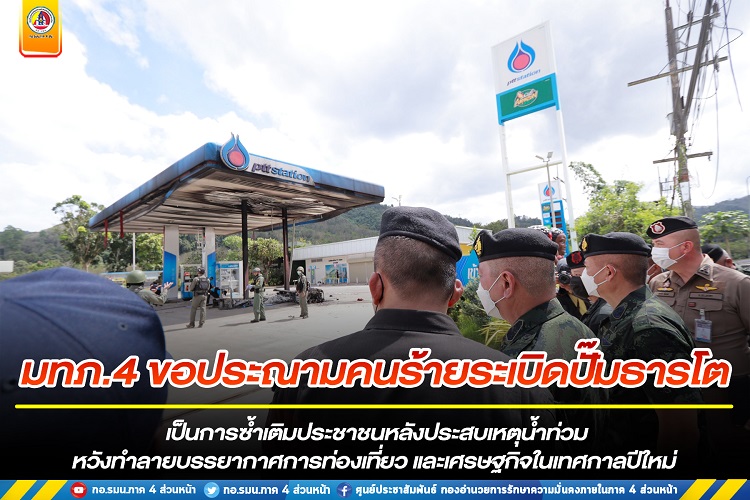 แม่ทัพภาคที่ 4 หลังรับฟังสรุปสถานการณ์ และลงพื้นที่เกิดเหตุ กล่าวว่า “ไม่รู้จะประณามคำไหนกับผู้ก่อเหตุให้สมกับการกระทำที่เป็นการซ้ำเติมพี่น้องประชาชน ก่อนหน้านี้ก็ได้รับผลกระทบจากภัยพิบัติอุทกภัยพึ่งจะฟื้นคืนมาได้นี่กลับต้องมาพบกับการกระทำที่สร้างความหวาดหวั่นให้เกิดขึ้นในพื้นที่อีก ถือว่าผู้ก่อเหตุรุนแรงฮึกเหิมมาก ในช่วงเวลาที่ทุกคนจะสร้างความสุขในเวลาของเทศกาลปีใหม่ การเดินทางไปมาที่ถือว่าเป็นเส้นหลักไปอำเภอเบตงซึ่งเป็นแหล่งท่องเที่ยวสำคัญของจังหวัดยะลา และก่อเหตุในแหล่งเศรษฐกิจเขตเมือง ทำให้ความเชื่อมั่นของพี่น้องประชาชนลดลง ความตั้งใจในการท่องเที่ยวก็อาจจะหยุดชะงักลง เศรษฐกิจที่กำลังจะดีก็อาจก็พลอยชะงักลงไปด้วย ขอความร่วมมือไปยังกำนันผู้ใหญ่บ้าน อส. ชคต. ตลอดจนเจ้าหน้าที่รับผิดชอบ ช่วยกันดูแลพื้นที่คุมเข้มไม่ให้มีการก่อเหตุซ้ำ ครั้งนี้ถือว่าโชคดีที่ไม่มีผู้ได้รับบาดเจ็บหรือเสียชีวิต แต่ถ้าหากทุกคนประมาทอีกครั้ง ไม่วายจะมีคนเจ็บและสูญเสียตามขึ้นมา ความเสียหายครั้งนี้แม้ไม่เกิดกับเจ้าหน้าที่รัฐโดยตรงแต่ก็เกี่ยวกับประชาชนโดยตรงเพราะเป็นสิ่งอำนวยความสะดวก แหล่งสาธารณูปโภคของพี่น้องประชาชนโดยส่วนรวม ขอเป็นกำลังใจให้ประชาชนในพื้นที่พร้อมผู้ประกอบการด้วย สิ่งที่เกิดขึ้นแล้ว จะไม่เกิดขึ้นอีกถ้าทุกคนช่วยกันฝากไปยังพี่น้องประชาชนในพื้นที่ หากพบเห็นสิ่งต้องสงสัยหรือบุคคลแปลกหน้าเข้ามาในพื้นที่แจ้ง หน่วยเฉพาะกิจจังหวัด หน่วยเฉพาะกิจในพื้นที่ หรือหมายเลขโทรศัพท์แม่ทัพภาคที่ 4 โดยตรง 061-1732999 ได้ตลอด 24 ชั่วโมง”