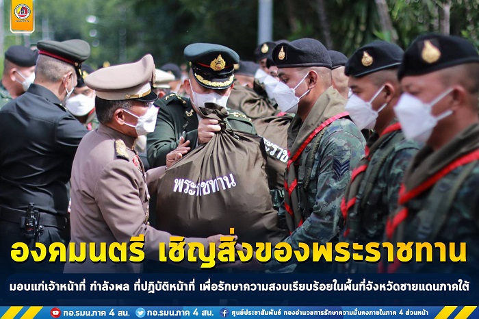 วันนี้ (27 ธันวาคม 2565) เวลา 08.00 น. ที่ สนามฟุตซอลนาควานิช กองอำนวยการรักษาความมั่นคงภายในภาค 4 ส่วนหน้า ค่ายสิรินธร ตำบลเขาตูม อำเภอยะรัง จังหวัดปัตตานี พระบาทสมเด็จพระเจ้าอยู่หัว และสมเด็จพระนางเจ้า ฯ พระบรมราชินี ทรงพระกรุณาโปรดเกล้าฯ ให้ พลเอก ไพบูลย์ คุ้มฉายา องคมนตรี เชิญสิ่งของพระราชทาน เนื่องในโอกาสปีใหม่ ประจำปีพุทธศักราช 2566 มอบแก่เจ้าหน้าที่ กำลังพล ที่ปฏิบัติหน้าที่ในพื้นที่ชายแดนภาคใต้ จำนวน 600 ชุด โดยมี นางพาตีเม๊าะ สะดียามู ผู้ว่าราชการจังหวัดปัตตานี กล่าวต้อนรับ จากนั้น พลโท ศานติ ศกุนตนาค แม่ทัพภาคที่ 4 / ผู้อำนวยการรักษาความมั่นคงภายในภาค 4 กล่าวสำนึกในพระมหากรุณาธิคุณ ตลอดจนผู้ว่าราชการจังหวัดยะลา ปัตตานี และนราธิวาส หน่วยกองกำลังทหาร ตำรวจ และฝ่ายพลเรือน เข้าร่วมในพิธี