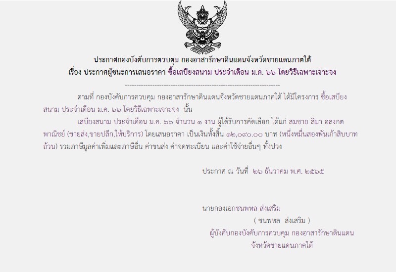 จัดซื้อ จัดจ้างประกาศผู้ชนะการเสนอราคา ประกาศผู้ชนะการเสนอราคา ซื้อเสบียงสนาม ประจำเดือน ม.ค. ๖๖ โดยวิธีเฉพาะเจาะจง December 28, 2022 533 Share Facebook Twitter Google+ Telegram LINE