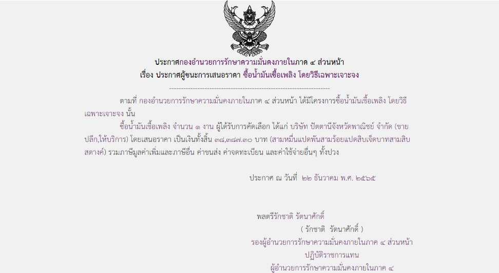 ประกาศผู้ชนะการเสนอราคา ซื้อน้ำมันเชื้อเพลิง โดยวิธีเฉพาะเจาะจง