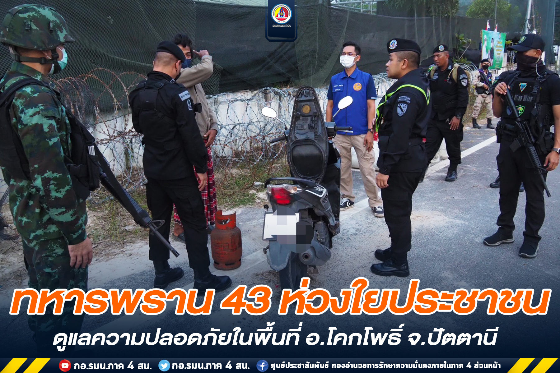 เมื่อวันที่ 30 ธันวาคม 2565 เวลา 16.00 – 18.30 น. ที่อำเภอโคกโพธิ์ จังหวัดปัตตานี พันเอก ปรเมธ ศานุพงศ์ ผู้บังคับหน่วยเฉพาะกิจกรมทหารพรานที่ 43 เดินทางตรวจเยี่ยม กำกับดูแล และให้กำลังใจการปฏิบัติภารกิจของกำลังพลชุดปฏิบัติการพิทักษ์พื้นที่ และชุดคุ้มครองตำบลที่ควบคุมดูแลพื้นที่ รวมถึงการรักษาความปลอดภัยเส้นทางรถไฟ ห้วงเทศกาลปีใหม่ เพื่อความปลอดภัยแก่ประชาชนในพื้นที่