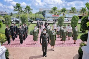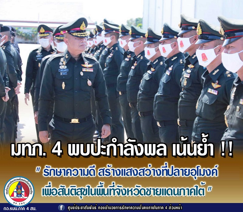 โดยแม่ทัพภาคที่ 4 ได้เดินทางสักการะสิ่งศักดิ์สิทธิ์ภายในค่ายสมเด็จพระสุริโยทัย ก่อนให้โอวาทแก่กำลังพลที่มายืนแถวต้อนรับ ว่า “ตลอดระยะเวลากว่า 2 ปี ในตำแหน่งแม่ทัพภาคที่ 4 สิ่งที่น่าชื่นชมตลอดคือความร่วมมือ ร่วมแรง ร่วมใจ ของกำลังพลทุกระดับชั้นด้วยดีเสมอมา เห็นถึงความเสียสละ ทุ่มเท ทั้งแรงกาย แรงใจ ต่อทุกภารกิจในพื้นที่จังหวัดชายแดนภาคใต้ เพียงเพื่ออุดมการณ์อันแรงกล้าในการรักษาไว้ซึ่งความสงบสุขร่มเย็นของพี่น้องประชาชนเป็นหลัก จนได้รับความไว้วางใจให้กองทัพภาคที่ 4 เป็นหน่วยงานหลักในการแก้ไขปัญหาจังหวัดชายแดนภาคใต้ ภายใต้สังคมพหุวัฒนธรรม ขอให้กำลังพลทุกนายใช้ความรัก ความสามัคคี เป็นคนดี และมีความจริงใจปฏิบัติงานในพื้นที่ สร้างโอกาส และจังหวะ สร้างผลงานอย่างจริงจัง เพื่อปลดทุกข์ในใจของชาวบ้าน สร้างแสงสว่างที่ปลายอุโมงค์ให้เกิดขึ้นในพื้นที่จังหวัดชายแดนภาคใต้ต่อไป”