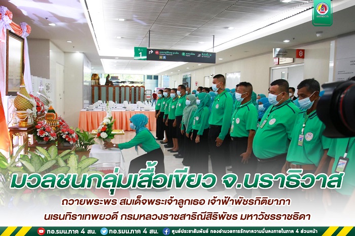 เมื่อวันที่ 4 มกราคม 2566 เวลา 10.00 น. เครือข่ายองค์กรภาคประชาชนเพื่อสันติและเศรษฐกิจพอเพียงจังหวัดนราธิวาส (กลุ่มเสื้อเขียว)ได้เข้าถวายพระพร สมเด็จพระเจ้าลูกเธอเจ้าฟ้าพัชรกิติยาภา นเรนทิราเทพยวดี กรมหลวงราชสาริณีสิริพัชร มหาวัชรราชธิดา ณ อาคารภูมิสิริมังคลานุสรณ์ โรงพยาบาลจุฬาลงกรณ์ สภากาชาดไทย ซึ่งเป็นกลุ่มมวลชนจังหวัดชายแดนภาคใต้ชุดแรกที่มีความประสงค์ และตั้งใจเดินทางไปถวายพระพร โดยได้รับการสนับสนุนเที่ยวบิน C -130 จากกองอำนวยการรักษาความมั่นคงภายในภาค 4 ส่วนหน้า ทั้งนี้ถือเป็นโอกาสอันดี ที่คณะฯ ได้ร่วมรับเสด็จ สมเด็จพระเจ้าลูกยาเธอ เจ้าฟ้าทีปังกรรัศมีโชติ มหาวชิโรตตมางกูร สิริวิบูลยราชกุมาร นอกจากนี้ยังจัดกิจกรรมให้มวลชนกลุ่มนี้ได้ไปร่วมทัศนศึกษาดูงานในพื้นที่ภาคกลาง เปิดประสบการณ์ที่ดีให้กับมวลชนในการใช้ชีวิตและการอยู่ร่วมกันในสังคมพหุวัฒนธรรมอีกด้วย
