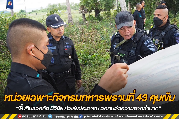 ทั้งนี้ผู้บังคับหน่วยเฉพาะกิจกรมทหารพรานที่ 43 ได้เน้นย้ำนโยบายและข้อสั่งการ ของ พลโท ศานติ ศกุนตนาค แม่ทัพภาคที่ 4/ผู้อำนวยการรักษาความมั่นคงภายในภาค 4 รวมถึงสอบถามปัญหาข้อขัดข้องในการปฏิบัติงาน และได้รับประทานอาหารมื้อเย็นร่วมกับกำลังพล อีกทั้งยังได้มอบสิ่งของอุปโภคบริโภคแก่กำลังพล เพื่อเป็นขวัญกำลังใจในการปฏิบัติภารกิจ