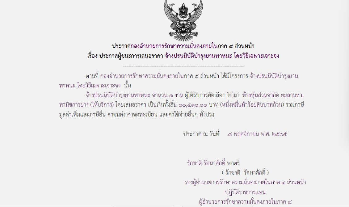 ประกาศผู้ชนะการเสนอราคา จ้างปรนนิบัติบำรุงยานพาหนะ โดยวิธีเฉพาะเจาะจง