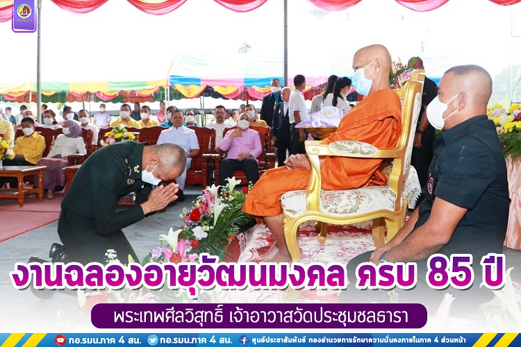 เมื่อวันที่ 7 มกราคม 2565 เวลา 0700 น. ที่วัดประชุมชลธารา ตำบลสุไหงปาดี จังหวัดนราธิวาส พลตรี เฉลิมพร ขำเขียว ผู้บัญชาการกองพลทหารราบที่ 15 / ผู้อำนวยการศูนย์ประสานงานโครงการอันเนื่องมาจากพระราชดำริ เป็นผู้แทน พลโท ศานติ ศกุนตนาค แม่ทัพภาคที่ 4/ผู้อำนวยการรักษาความมั่นคงภายในภาค 4 ร่วมงานในพิธีฉลองอายุวัฒนมงคล ครบรอบ 85 ปี พระเทพศีลวิสุทธิ์ ที่ปรึกษาเจ้าคณะที่ 18/ เจ้าอาวาสวัดประชุมชลธารา เพื่อเป็นการแสดงมุทิตาจิตแด่พระเทพศีลวิสุทธ์ ซึ่งเป็นพระนักพัฒนาและเป็นที่พึ่งทางจิตใจของพุทธศาสนิกชนในพื้นที่ พร้อมทั้งยังเป็นผู้นำในการสร้างความสามัคคีระหว่างประชาชนโดยไม่มีการแบ่งแยกศาสนา โดยมี หัวหน้าส่วนราชการ เจ้าหน้าที่ คณะศิษยานุศิษย์ และประชาชนทั้งชาวไทยพุทธ ชาวไทยมุสลิม ร่วมงานจำนวนมาก