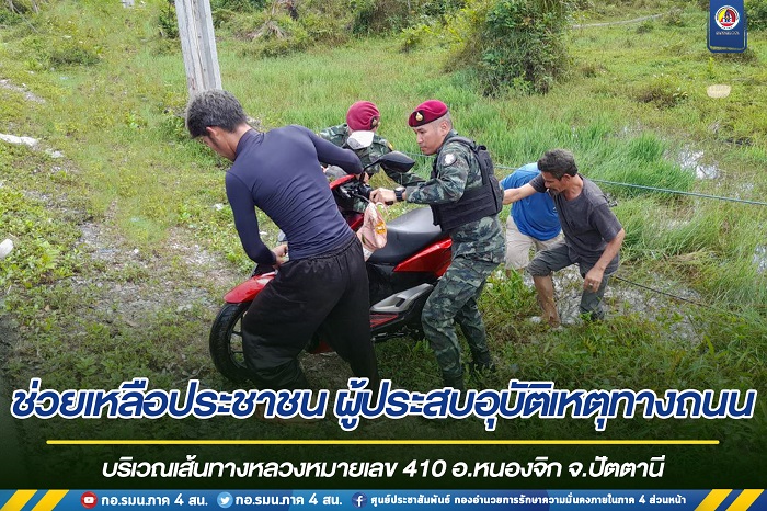 หน่วยเฉพาะกิจสันติสุข โดยชุดสันติสุขที่ 102 จัดกำลังพลเข้าให้การช่วยเหลือประชาชนประสบอุบัติเหตุทางถนน บริเวณเส้นทางหลวงหมายเลข 410 อำเภอหนองจิก จังหวัดปัตตานี ในขณะเดินทางไปปฏิบัติหน้าที่ในพื้นที่ โดยในที่เกิดเหตุพบรถจักรยานยนต์ เสียหลักลงข้างถนน จึงได้เข้าตรวจสอบพร้อมให้ความช่วยเหลือประชาชนที่ประสบอุบัติเหตุ โดยเจ้าหน้าที่ได้ปฐมพยาบาลขั้นต้นให้กับผู้ได้รับบาดเจ็บ และประสานส่วนเจ้าหน้าที่กู้ภัยเพื่อนำผู้ประสบเหตุส่งโรงพยาบาลในพื้นที่เพื่อรักษาต่อไป