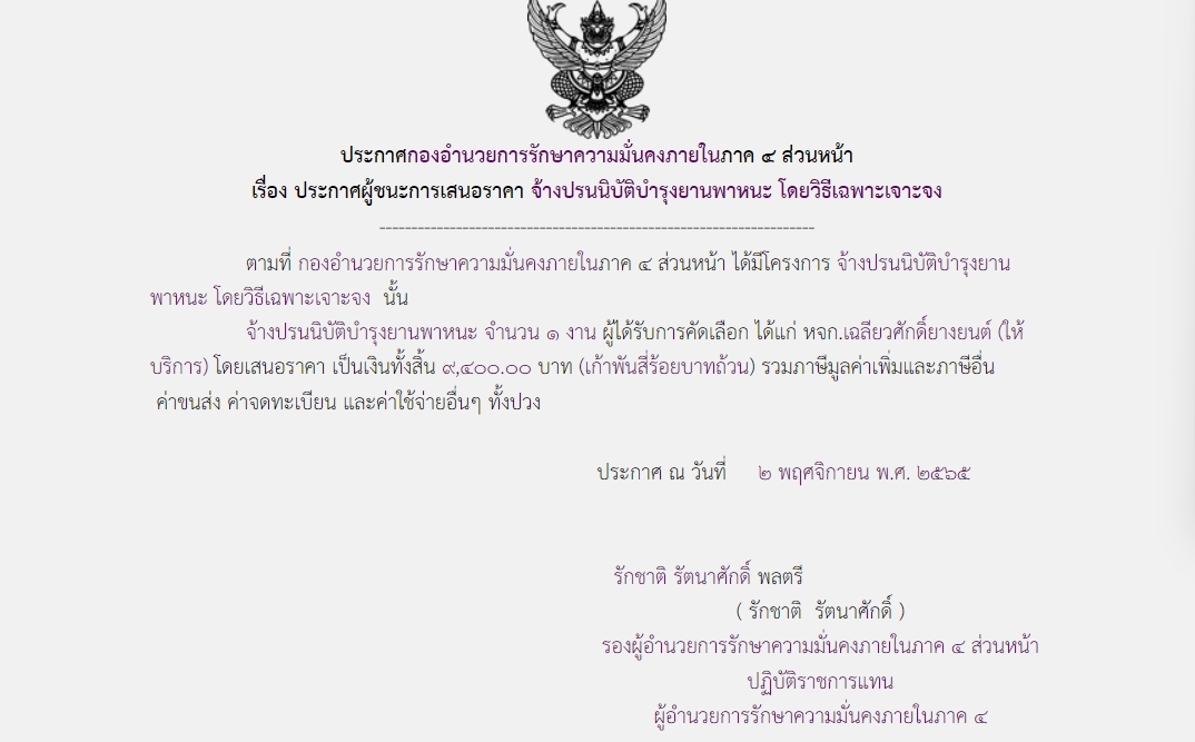 ประกาศผู้ชนะการเสนอราคา จ้างปรนนิบัติบำรุงยายพาหนะ โดยวิธีเฉพาะเจาะจง