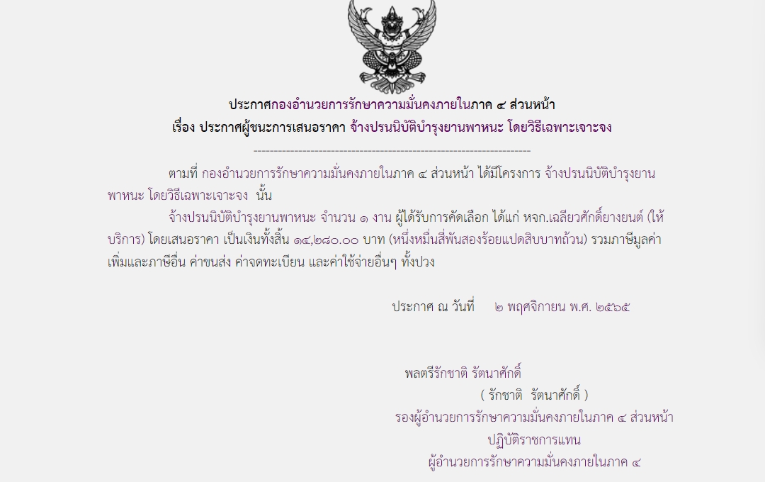 ประกาศผู้ชนะการเสนอราคา จ้างปรนนิบัติบำรุงยายพาหนะ โดยวิธีเฉพาะเจาะจง