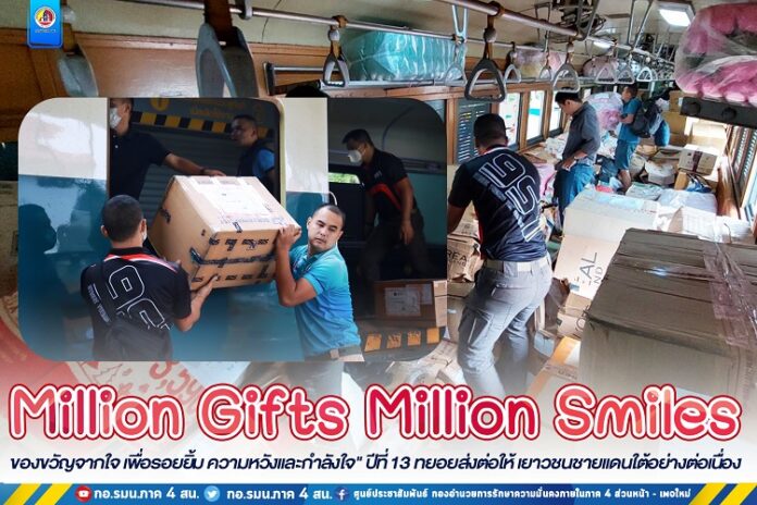 วันนี้ (9 มกราคม 2566) เวลา 09.00 น. ที่สถานีรถไฟโคกโพธิ์ อำเภอโคกโพธิ์ จังหวัดปัตตานี กองอำนวยการรักษาความมั่นคงภายในภาค 4 ส่วนหน้า รับมอบของขวัญวันเด็กแห่งชาติ Million Gifts Million Smiles “ของขวัญจากใจ เพื่อรอยยิ้ม ความหวังและกำลังใจ” ปีที่ 13 เป็นวันที่ 2 เพื่อสร้างโอกาส และส่งต่อรอยยิ้ม ผ่านการส่งมอบของขวัญในช่วงเทศกาลปีใหม่และวันเด็กในปี 2566 โดยมี กำลังพลจากกองอำนวยการรักษาความมั่นคงภายในภาค 4 ส่วนหน้า ร่วมกันลำเลียงของขวัญและเตรียมพร้อมส่งมอบไปยังหน่วยในพื้นที่ เพื่อเป็นของขวัญให้เยาวชนในวันเด็กแห่งชาติ ในวันเสาร์ที่ 14 มกราคม 2566
