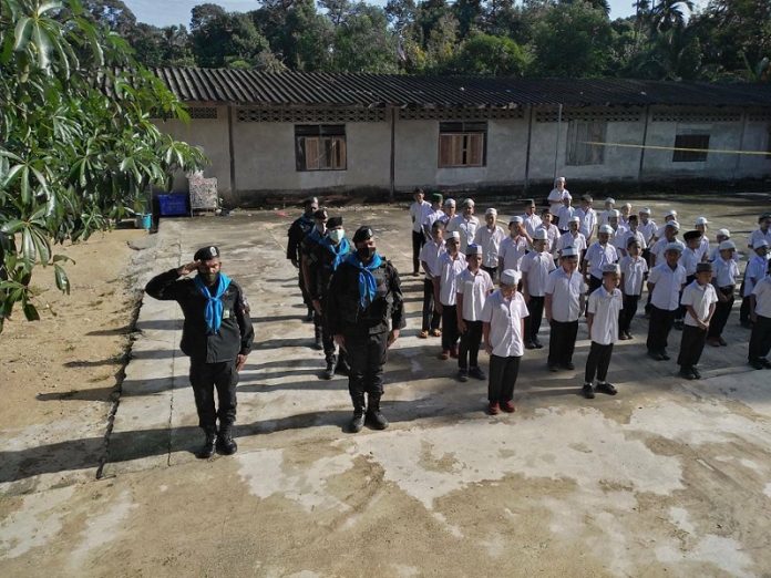 วันที่ 26 กันยายน 2563 เวลา 08.00 น. ที่ โรงเรียนตาดีกาอัลอิสลามมียะห์ บ้านสะเตียร์ หมู่ที่ 5 ตำบลบูกิต อำเภอเจาะไอร้อง จังหวัดนราธิวาส หน่วยเฉพาะกิจกรมทหารพรานที่ 48 ร่วมกิจกรรมเข้าแถวเคารพธงชาติ ปลูกฝังอุดมการณ์ความรักชาติ ความเป็นไทย เสริมสร้างความเข้าใจ ให้มีทัศนคติที่ดีต่อบุคลากรทางการศึกษาและนักเรียน นอกจากนี้ ได้ร่วมความสะอาด รวมทั้งเก็บกวาดขยะใบไม้ ปรับปรุงภูมิทัศน์บริเวณโดยรอบโรงเรียนตาดีกาให้มีความสะอาด สวยงาม ในพื้นที่ โดยมี นักเรียนและคณะครู เข้าร่วมกิจกรรมในครั้งนี้