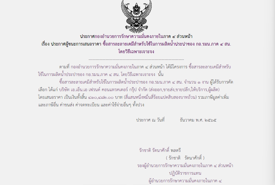 ประกาศผู้ชนะการเสนอราคา ซื้อสารละลายเคมีสำหรับใช้ในการผลิตน้ำประปาของ กอ.รมน.ภาค ๔ สน. โดยวิธีเฉพาะเจาะจง