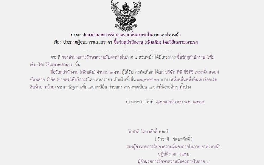 ประกาศผู้ชนะการเสนอราคา ซื้อวัสดุสำนักงาน (เพิ่มเติม) โดยวิธีเฉพาะเจาะจง