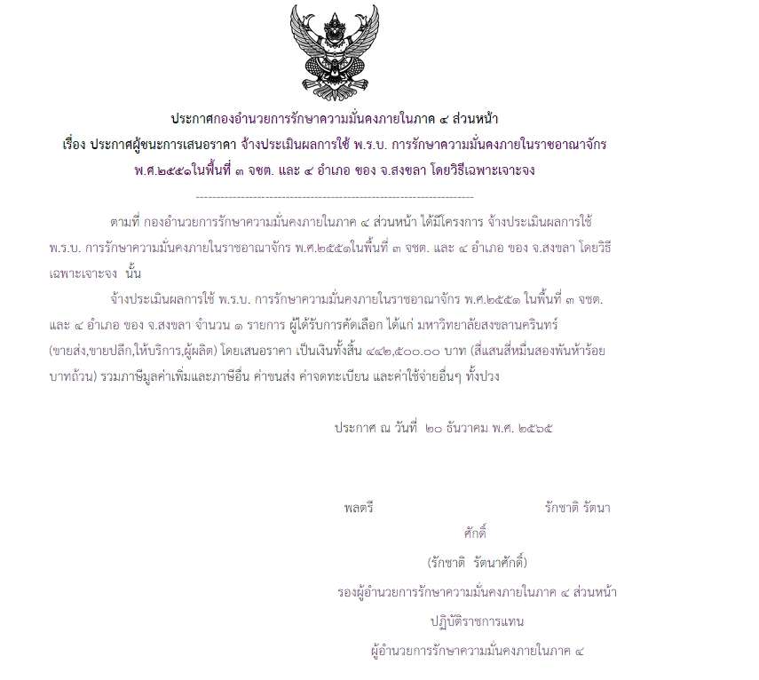 จัดซื้อ จัดจ้างประกาศผู้ชนะการเสนอราคา ประกาศผู้ชนะการเสนอราคา จ้างประเมินผลการใช้ พ.ร.บ. การรักษาความมั่นคงภายในราชอาณาจักร พ.ศ.๒๕๕๑ ในพื้นที่ ๓ จชต. และ ๔ อำเภอ ของ จ.สงขลา โดยวิธีเฉพาะเจาะจง January 14, 2023 416 Share Facebook Twitter Google+ Telegram LINE