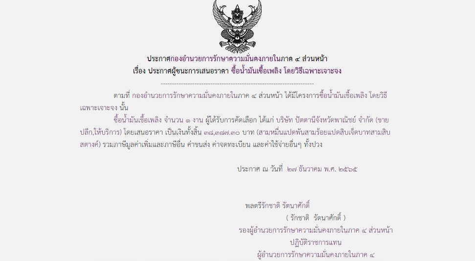 ประกาศผู้ชนะการเสนอราคา ซื้อน้ำมันเชื้อเพลิง โดยวิธีเฉพาะเจาะจง
