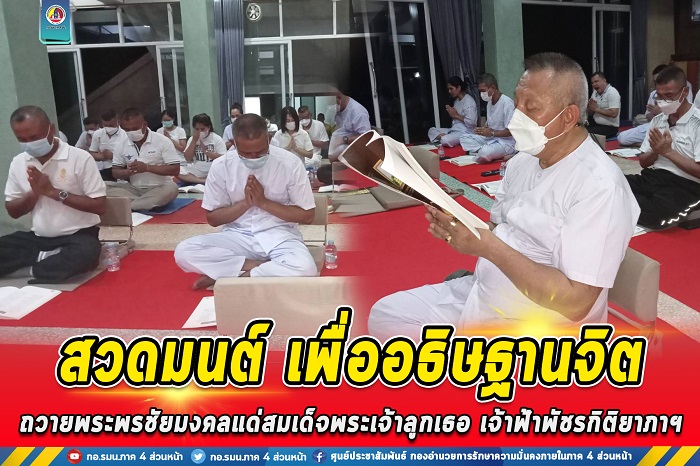 ทั้งนี้ กองอำนวยการรักษาความมั่นคงภายในภาค 4 ส่วนหน้า ได้จัดให้มีพิธีไหว้พระสวดมนต์ตามแบบธรรมเนียมทหารประจำสัปดาห์ เพื่อเป็นการปลูกฝังศีลธรรมอันดีงามแก่กำลังพล และส่งเสริมให้กำลังพลได้ปฏิบัติหน้าที่ของพุทธศาสนิกชนที่ดี เพื่อความเป็นสิริมงคลเเก่ชีวิตและน้อมหลักธรรมคำสอนไปประยุกต์ใช้ในการดำเนินชีวิต และปฏิบัติภารกิจหน้าที่การงานให้ประสบความสำเร็จ และเจริญก้าวหน้าสัมฤทธิ์ผลเป็นรูปธรรม ซึ่งสอดล้องกับนโยบายการปลูกฝังและการสร้างเสริมอุดมการณ์ทหารของกองทัพบก “ด้านการพัฒนาคุณธรรม”