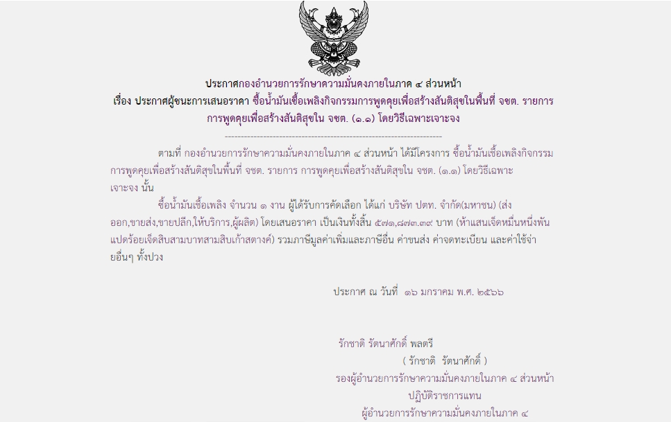 จัดซื้อ จัดจ้างประกาศผู้ชนะการเสนอราคา ประกาศผู้ชนะการเสนอราคา ซื้อน้ำมันเชื้อเพลิงกิจกรรมการพูดคุยเพื่อสร้างสันติสุขในพื้นที่ จชต. รายการ การพูดคุยเพื่อสร้างสันติสุขใน จชต. (๑.๑) โดยวิธีเฉพาะเจาะจง January 16, 2023 425 Share Facebook Twitter Google+ Telegram LINE