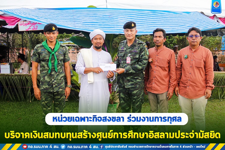 เมื่อวันที่ 15 มกราคม 2566 เวลา 14.00 น. ที่ ศูนย์การศึกษาอิสลามประจำมัสยิด (ตาดีกา) บ้านสาไหน หมู่ที่ 2 ตำบลทุ่งพอ อำเภอสะบ้าย้อย จังหวัดสงขลา พันเอก ปัญญาพล สุรทิณฑ์ รองผู้บังคับหน่วยเฉพาะกิจสงขลา ร่วมงานการกุศล บริจาคเงินสมทบทุนสร้างศูนย์การศึกษาอิสลามประจำมัสยิด (ตาดีกา) บ้านสาไหน และพบปะพูดคุยกับผู้นำศาสนา พร้อมทั้งร่วมรับประทานอาหาร เพื่อแลกเปลี่ยนความคิดเห็นสร้างความสัมพันธ์อันดีระหว่างเจ้าหน้าที่รัฐกับผู้นำศาสนา ทั้งนี้ ศูนย์การศึกษาอิสลามประจำมัสยิด (ตาดีกา) บ้านสาไหน ถือเป็นแหล่งที่ให้ความรู้ โดยใช้หลักศาสนาในการอบรมจริยธรรมแก่เยาวชน ถือว่าเป็นแนวทางหนึ่งในการแก้ไขปัญหาของสังคม โดยเฉพาะการกล่อมเกลาจิตใจให้อยู่ในหลักศาสนาได้