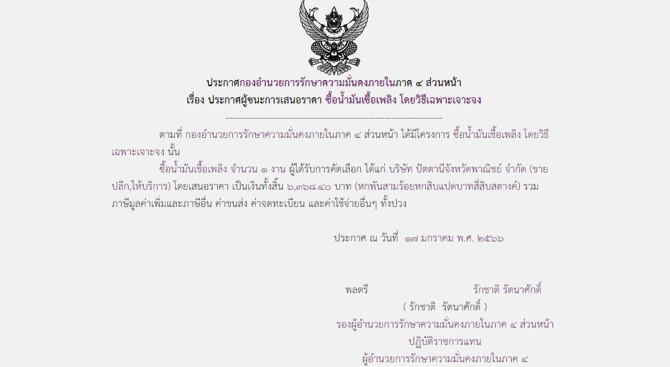 ประกาศผู้ชนะการเสนอราคา ซื้อน้ำมันเชื้อเพลิง โดยวิธีเฉพาะเจาะจง