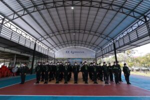 โอกาสนี้ แม่ทัพภาคที่ 4 ได้เป็นประธานเปิดป้ายอาคารโดมอเนกประสงค์ “เค.เค.ยิมเนเซี่ยม กรมทหารพรานที่ 43” ซึ่งอาคารดังกล่าวได้ริเริ่มโดย พันเอก ทวีพร คณะทอง อดีตผู้บังคับการกรมทหารพรานที่ 43 ต้องการสร้างไว้เพื่อเป็นสถานที่ในการจัดกิจกรรมของหน่วย อีกทั้งใช้เป็นสถานที่ออกกำลังกายของกำลังพล ซึ่งได้ดำเนินการสร้างไปได้ระยะหนึ่ง ต่อมา พลเอก เกรียงไกร ศรีรักษ์ ผู้ช่วยผู้บัญชาการทหารบก อดีตแม่ทัพภาคที่ 4 ได้ให้ความอนุเคราะห์ในการช่วยเหลือสนับสนุนงบประมาณในการสร้างเพิ่มเติมจนสำเร็จลุล่วงตามความปรารถนาของหน่วย ในฐานะที่ พลเอก เกรียงไกร ศรีรักษ์ ผู้ช่วยผู้บัญชาการทหารบก อดีตแม่ทัพภาคที่ 4 ท่านเป็นบุคคลที่มีบทบาทในการขับเคลื่อนนโยบายในการแก้ปัญหาความรุนแรงในพื้นที่จังหวัดชายแดนภาคใต้ในห้วงที่ผ่านมา มีผลงานประจักษ์ควรที่จะได้รับการจารึกชื่อไว้และยกย่องเชิดชูเกียรติให้เป็นที่ปรากฎ กรมทหารพรานที่ 43 จึงขอตั้งชื่ออาคารหลังนี้ว่า “เค.เค.ยิมเนเชี่ยม กรมทหารพรานที่ 43 ” เพื่อเป็นเกียรติประวัติแก่ พลเอก เกรียงไกร ศรีรักษ์ สืบต่อไป