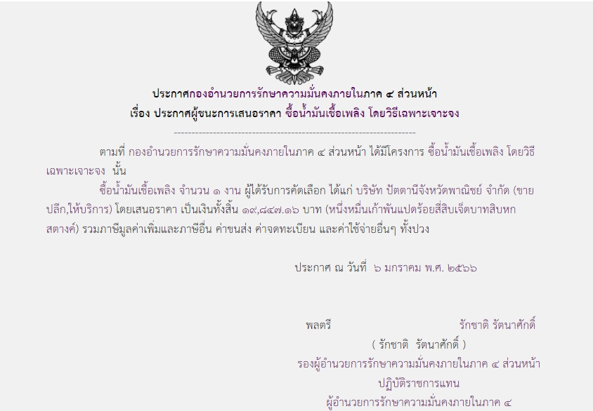 ประกาศผู้ชนะการเสนอราคา ซื้อน้ำมันเชื้อเพลิง โดยวิธีเฉพาะเจาะจง