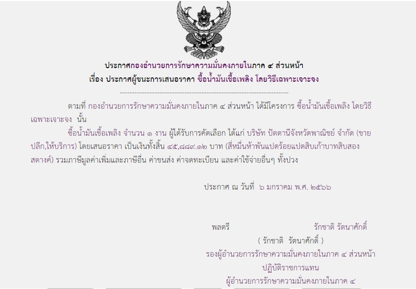 ประกาศผู้ชนะการเสนอราคา ซื้อน้ำมันเชื้อเพลิง โดยวิธีเฉพาะเจาะจง