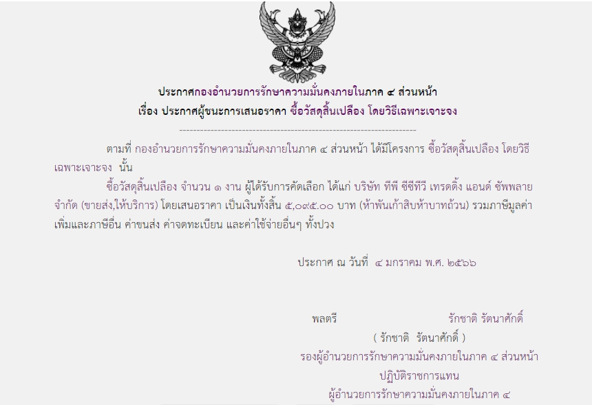 ประกาศผู้ชนะการเสนอราคา ซื้อวัสดุสิ้นเปลือง โดยวิธีเฉพาะเจาะจง