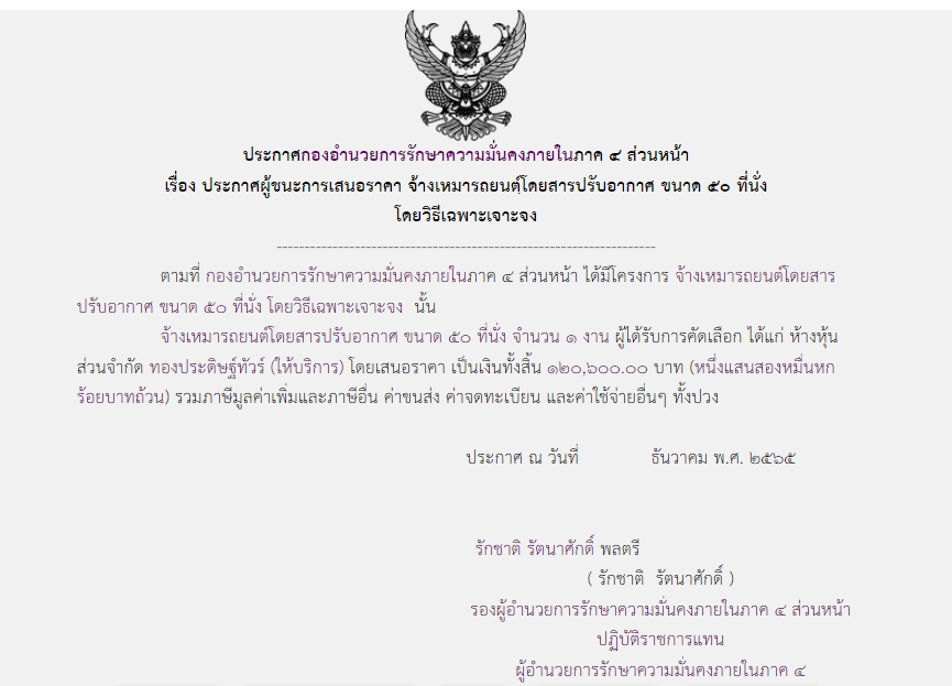 ประกาศผู้ชนะการเสนอราคา จ้างเหมารถยนต์โดยสารปรับอากาศ ขนาด ๕๐ ที่นั่ง โดยวิธีเฉพาะเจาะจง