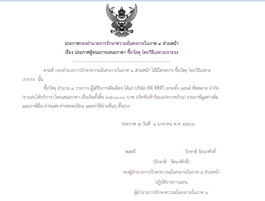 ประกาศผู้ชนะการเสนอราคา ซื้อวัสดุ โดยวิธีเฉพาะเจาะจง