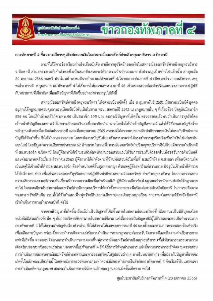 ตามที่ได้มีการร้องเรียนผ่านโซเชียลมีเดีย กรณีการทุจริตยักยอกเงินในสหกรณ์ออมทรัพย์ค่ายอิงคยุทธบริหาร จ.ปัตตานี ส่งผลกระทบต่อกำลังพลซึ่งเป็นสมาชิกสหกรณ์ดังกล่าวเป็นจำนวนมาก ดังปรากฎเป็นข่าวไปแล้วนั้น ล่าสุดเมื่อ 20 มกราคม 2566 พลตรี ปราโมทย์ พรหมอินทร์ รองแม่ทัพภาคที่ 4 / โมษกกองทัพภาคที่ 4 เปิดเผยว่า ภายหลังทราบเหตุ พลโท ศานติ ศกุนตนาค แม่ทัพภาคที่ 4 ได้สั่งการให้มณฑลทหารบกที่ 46 เข้าตรวจสอบข้อเท็จจริงและประสานการปฏิบัติกับหน่วยงานที่เกี่ยวข้องเพื่อแก้ไขปัญหาที่เกิดขึ้นอย่างเร่งด่วน สรุปได้ดังนี้