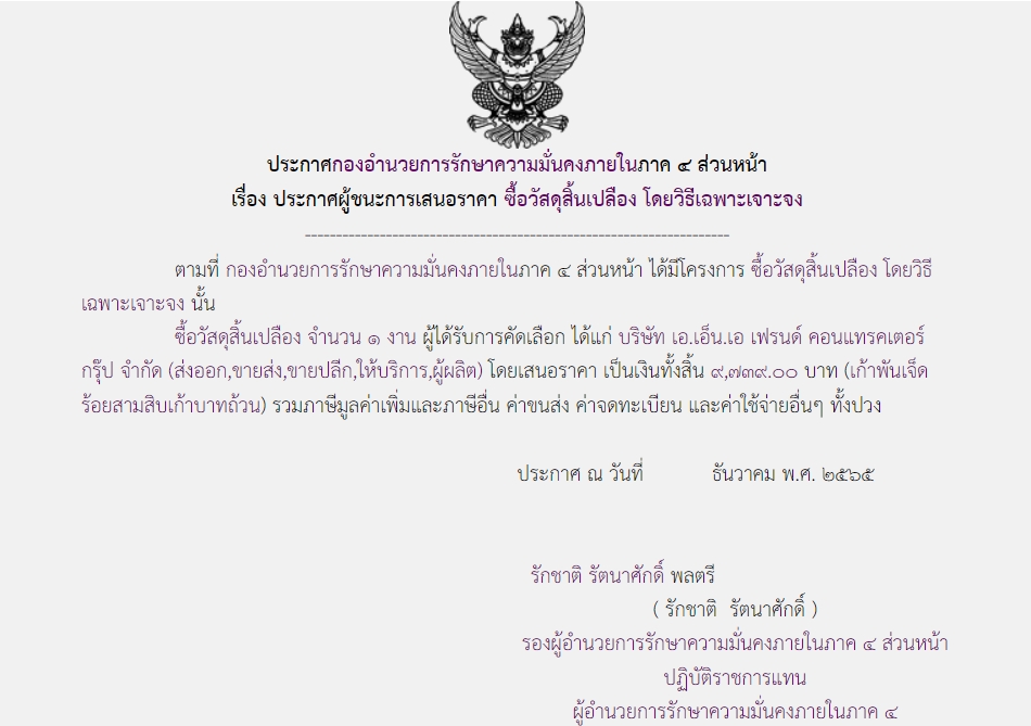 ประกาศผู้ชนะการเสนอราคา ซื้อวัสดุสิ้นเปลือง โดยวิธีเฉพาะเจาะจง