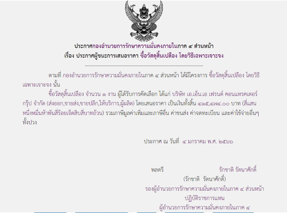 ประกาศผู้ชนะการเสนอราคา ซื้อวัสดุสิ้นเปลือง โดยวิธีเฉพาะเจาะจง