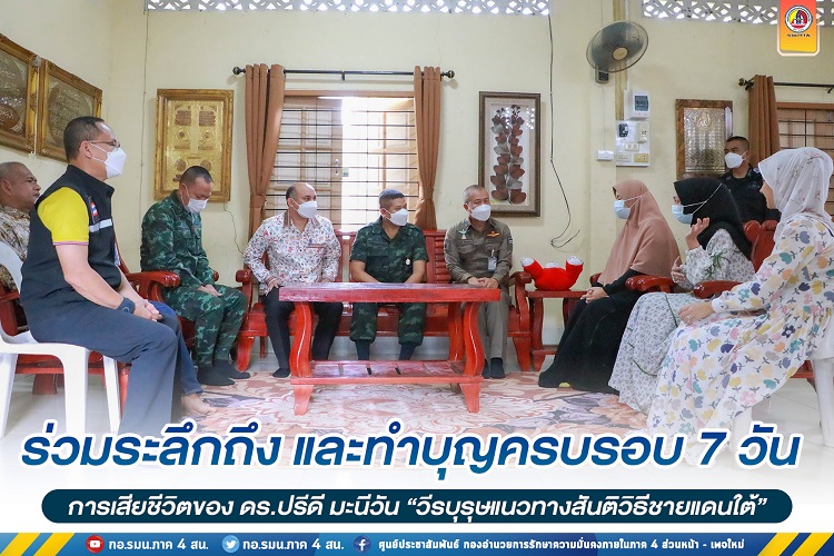 วันนี้ ( 21 มกราคม 2566 ) เวลา 12.00 น. ณ บ้านเลขที่ 160 หมู่ที่ 5 ตำบลยะรัง อำเภอยะรัง จังหวัดปัตตานี พลตรี ไพศาล หนูสังข์ รองแม่ทัพภาคที่ 4/ รองผู้อำนวยการรักษาความมั่นคงภายในภาค 4 ส่วนหน้า และคณะ เยี่ยมให้กำลังใจแสดงความอาลัย และร่วมงานทำบุญครบรอบ 7 วัน หลังจากการเสียชีวิต ของ ดร.ปรีดี มะนีวัน ที่ปรึกษาสมาคมเพื่อสันติภาพชายแดนใต้ (POSBO)/นักวิชาการวัฒนธรรมชำนาญการสำนักงานวัฒนธรรมจังหวัดปัตตานี ซึ่งเสียชีวิตจากโรคประจำตัว เมื่อวันที่ 15 มกราคม 2566 ที่ผ่านมา