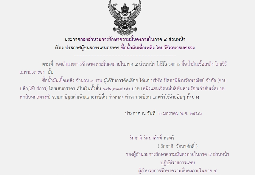 ประกาศผู้ชนะการเสนอราคา ซื้อน้ำมันเชื้อเพลิง โดยวิธีเฉพาะเจาะจง