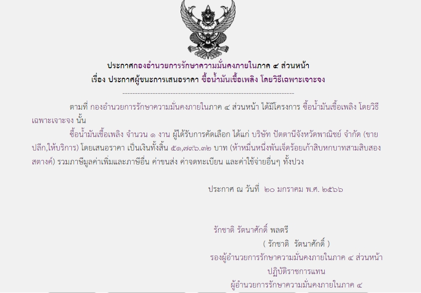 ประกาศผู้ชนะการเสนอราคา ซื้อน้ำมันเชื้อเพลิง โดยวิธีเฉพาะเจาะจง