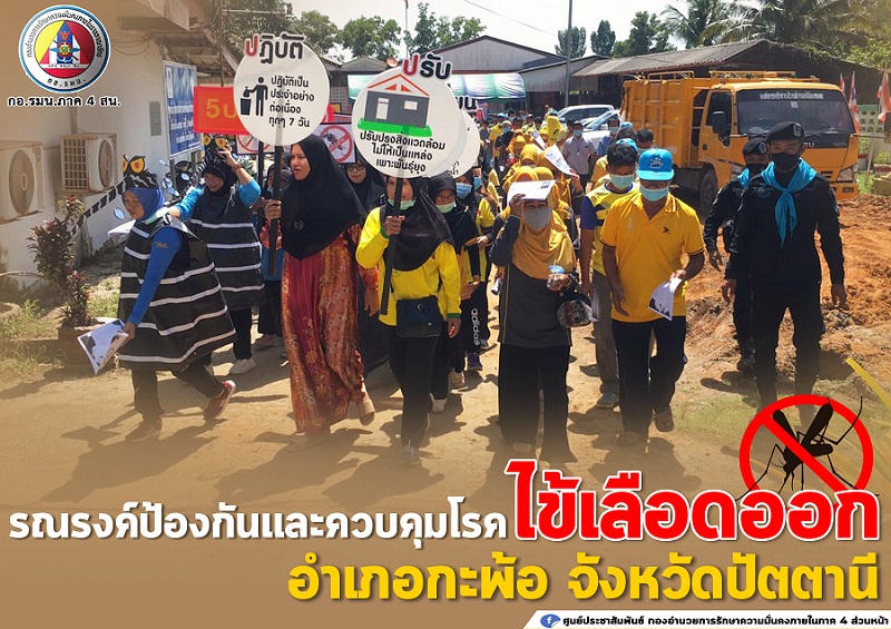 หน่วยเฉพาะกิจกรมทหารพรานที่ 44 ร่วมกับ เจ้าหน้าที่อำเภอกะพ้อ ,สาธารณสุข ตำบลปล่องหอย, ผู้นำท้องที่, ผู้นำท้องถิ่น, ส่วนราชการ, บัณฑิตอาสา และ ประชาชนในพื้นที่ ตำบลปล่องหอย ร่วมกิจกรรมเดินขบวนรณรงค์ป้องกันและควบคุมโรคไข้เลือดออก พร้อมทั้งแจกแผ่นพับเพื่อส่งเสริมความรู้และพฤติกรรมสุขภาพด้านการจัดการตนเองเกี่ยวกับการป้องกันและควบคุมโรคโรคติดต่อให้กับประชาชนในพื้นที่ ภายใต้โครงการเสริมสร้างความเข้มแข็งให้กับหมู่บ้านชุมชนและตำบล จังหวัดชายแดนใต้ ประจำปีงบประมาณ 2563 ณ อบต.ปล่องหอย บ้านบาโงสาเมาะ หมู่ 3 ตำบลปล่องหอย อำเภอกะพ้อ จังหวัดปัตตานี