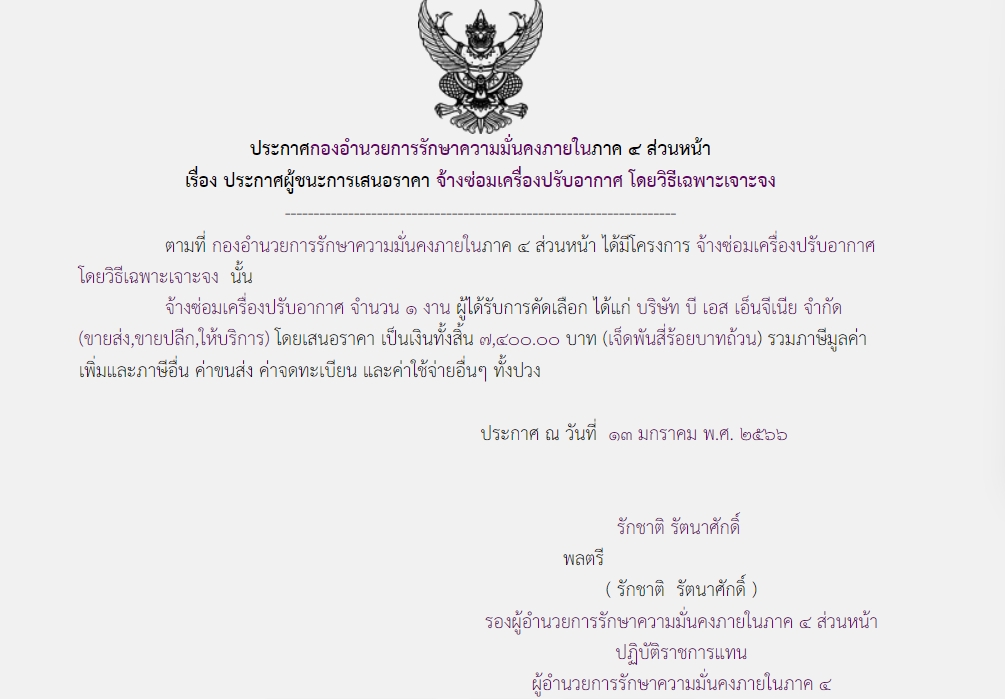 ประกาศผู้ชนะการเสนอราคา จ้างซ่อมเครื่องปรับอากาศ โดยวิธีเฉพาะเจาะจง
