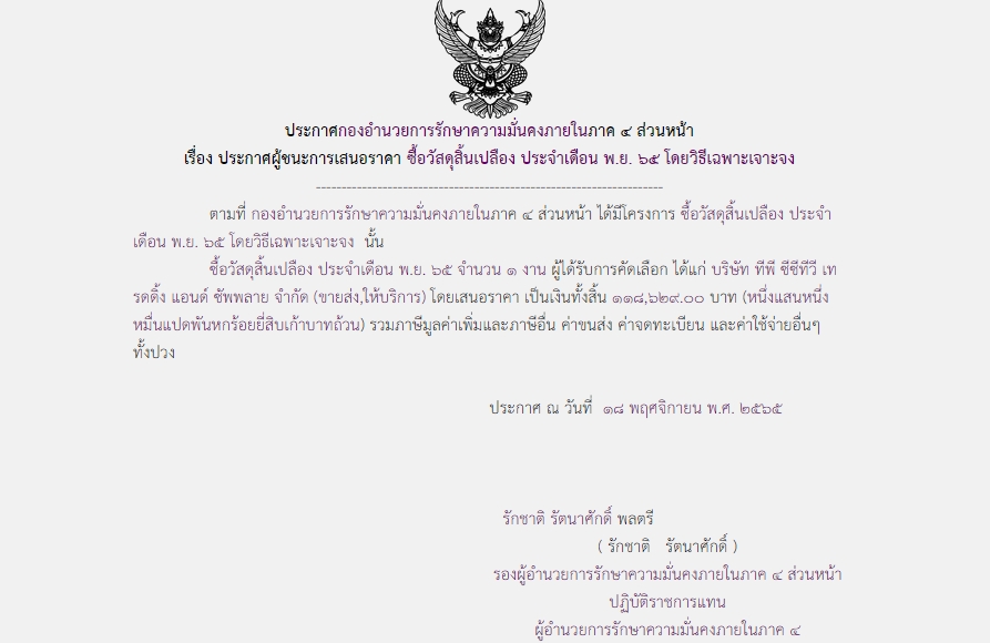 ประกาศผู้ชนะการเสนอราคา ซื้อวัสดุสิ้นเปลือง ประจำเดือน พ.ย. ๖๕ โดยวิธีเฉพาะเจาะจง