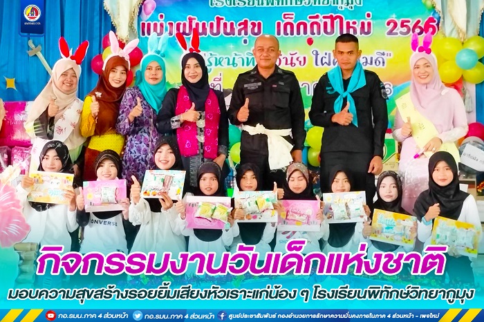 ทั้งนี้ กองร้อยทหารพรานที่ 4905 หน่วยเฉพาะกิจกรมทหารพรานที่ 49 ได้สนับสนุนรถจักรยาน 1 คัน ไอศกรีม 1 ถัง ให้กับน้อง ๆ นักเรียน เพื่อเป็นการสนับสนุนกิจกรรมเสริมทักษะ การเรียนรู้ และกล้าแสดงออก ให้กับเยาวชนในพื้นที่ ดังคำขวัญวันเด็กจากนายกรัฐมนตรีว่า “รู้หน้าที่ มีวินัย ใฝ่ความดี” ซึ่งกิจกรรมในครั้งนี้สร้างความสุข เสียงหัวเราะแก่น้อง ๆ ในพื้นที่เป็นอย่างมาก