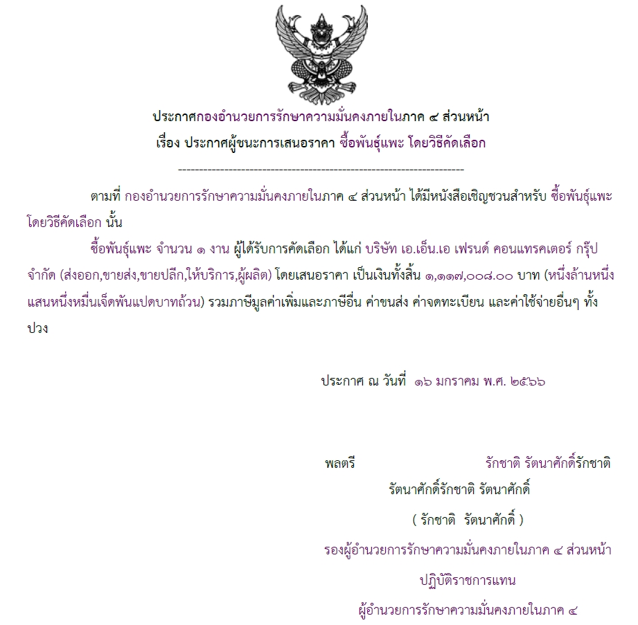 ประกาศผู้ชนะการเสนอราคา ซื้อพันธุ์แพะ โดยวิธีคัดเลือก