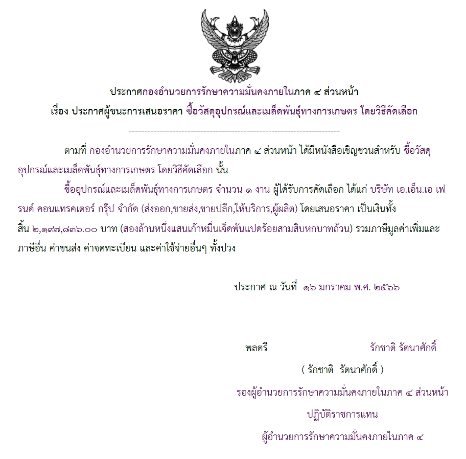 ประกาศผู้ชนะการเสนอราคา ซื้อวัสดุอุปกรณ์และเมล็ดพันธุ์ทางเกษตร โดยวิธีคัดเลือก